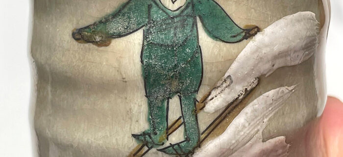 小出雲坂を滑り降りた先に待つ、熱々の肉料理と文明の味 雪山を滑る緑のスキーヤー 少し黄味を帯びた温かな白釉の肌に、緑色のウェアを着たスキーヤーが気持ちよさそうに滑降しています。轆轤(ろくろ)の目が強く残る凹凸の激しい器 …