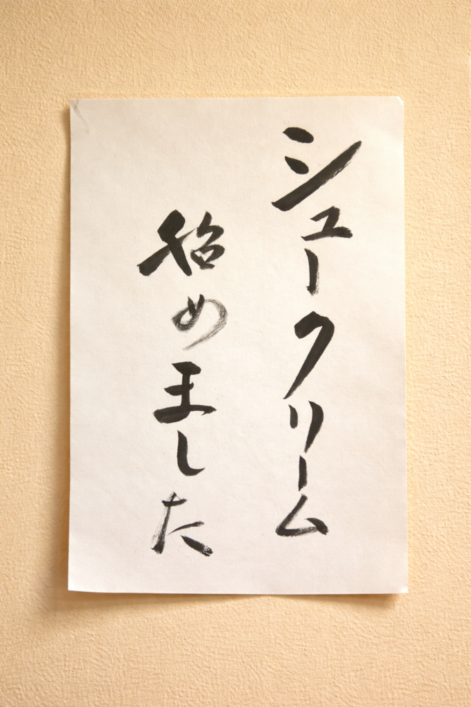 冷たく身にしみる秋風が町に吹き始めると、毎年決まって「シュークリームはありますか」という、お客様からの電話がかかってきます。その声にせかされるように、牛乳・卵・砂糖の仕入れ量が一気に増え始め、二代目は「シュークリーム始めました」の直筆の張り紙を毎年準備します。そして、いよいよスタートという日に店先に張り出します。